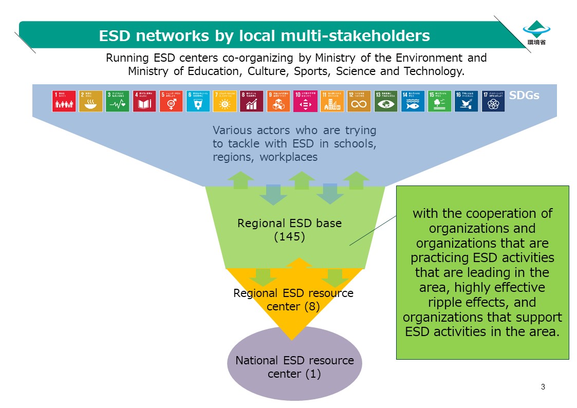In order to promote the approaches mentioned previously, we believe that it is important to cooperate with multi-stakeholders to establish the nationwide ESD promotion network. MOE and MEXT opened the national ESD resource center in April 2016. 8 regional ESD resource centers followed it in July, 2017. We have made an effort to promote regional development, human resource development, and infrastructure development to realize a sustainable society through both environmental education and ESD.